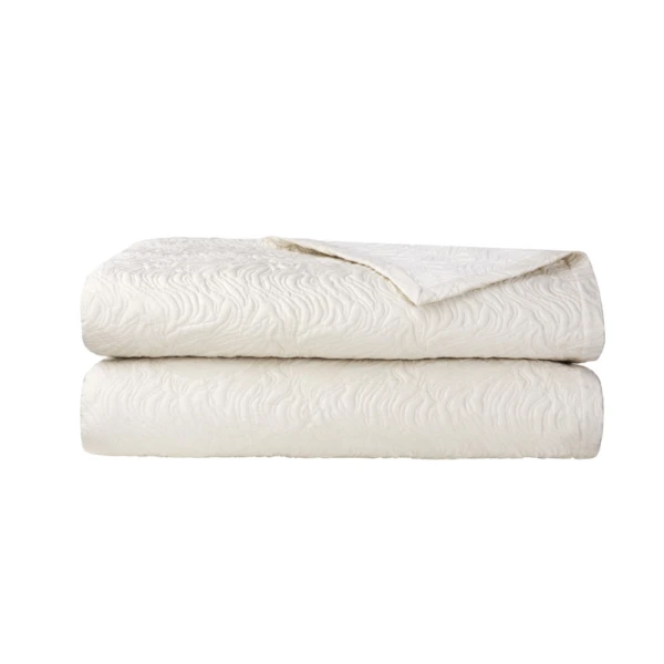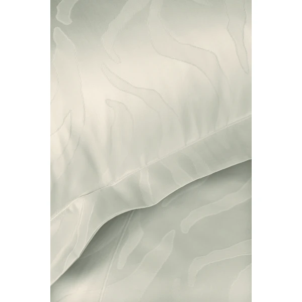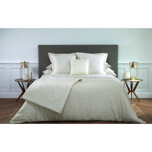 Amazone, from Yves Delorme, is a jacquard woven pattern that evokes your imagination. Animal print, waves on a beach, or glittering reflections in a pond, this bedding is a rich ecru color and destined for a master suite. 500 TC the pattern has a hand like silk. Duvet, shams, and quilt reverse to a solid ecru The fitted sheet is also the solid ecru. The matching counterpane and decorator pillow are both embroidered on a 60% cotton/40% silk background.