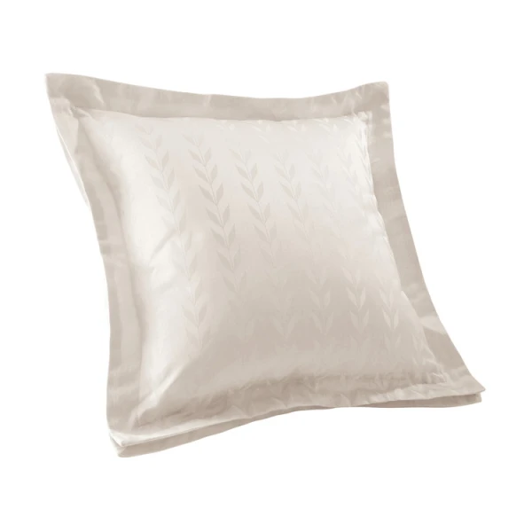 The Yves Delorme Antique decorator pillow from Yves DeLorme is 40% silk and 60% cotton. The damask sateen fabric has the laurel leaf pattern woven throughout. Finished with a double flange all around.  Coordinates with Forum, Antique and Laurier bedding.