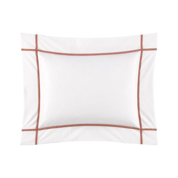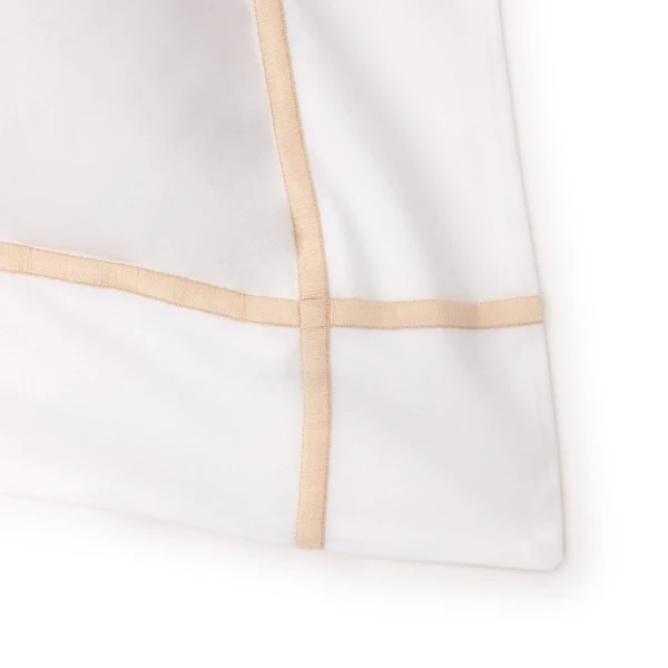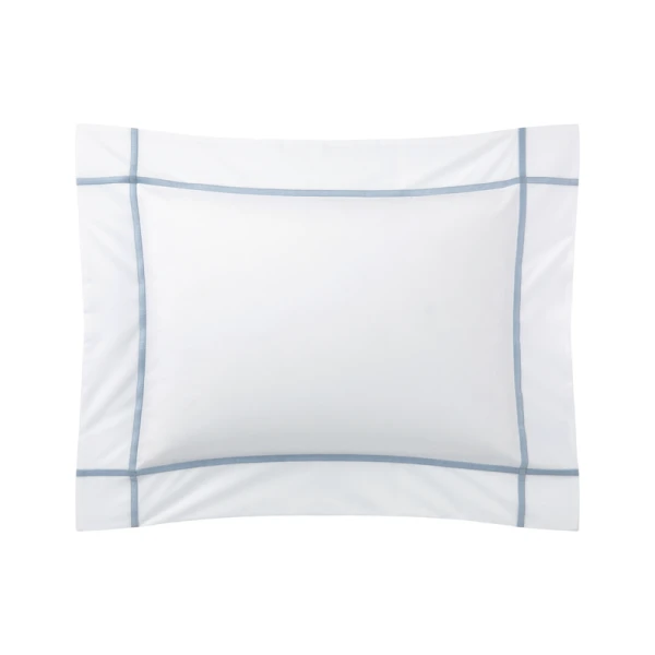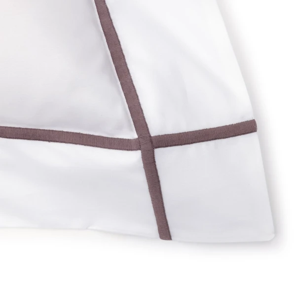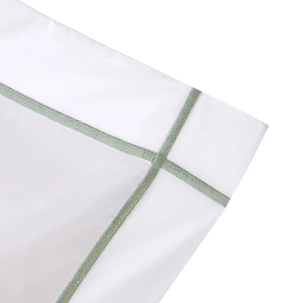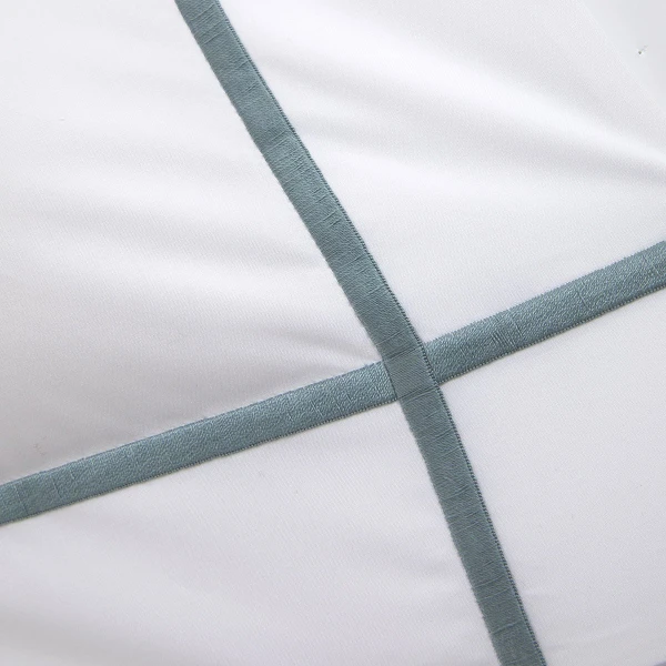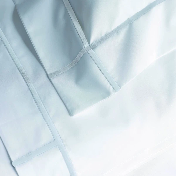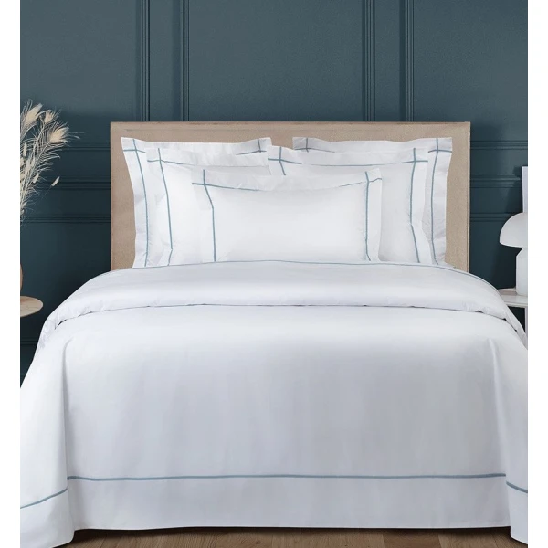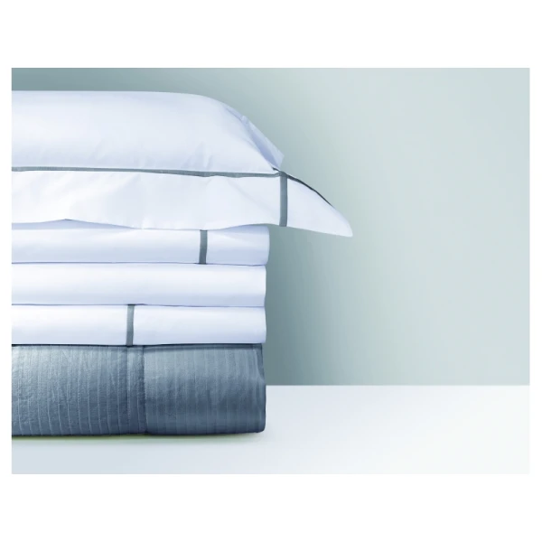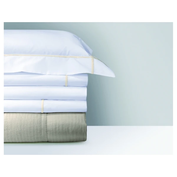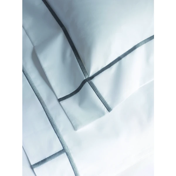 Yves Delorme's version of luxury hotel sheeting, Athena was quick to become a staff favorite.  Thick embroidered crossing borders make it stand out from other hotel sheeting, and it looks beautiful monogrammed. A wonderful luxury percale -- 500 thread count. Made from 100% supima extra long staple combed cotton percale.  Extra long twin is available. Fitted sheet is the Roma white fitted sheet. Ten colors to mix and match with Triomphe.