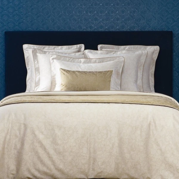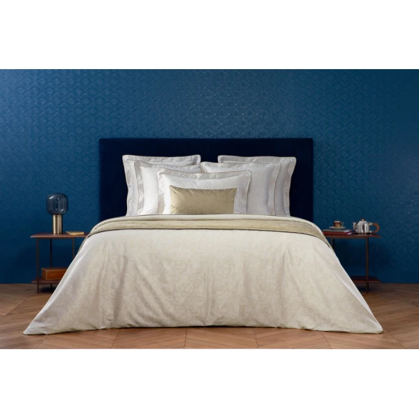 Yves Delorme's Belami is an Ivory colored Damask Sateen. The Damask resembles flourishing vines with blossoming flowers. If grand and elegant is what you are looking for this one is for you. The look of Bel Ami is luxurious. Shams and duvet cover are damask which is finished with a beautiful bronzed amber that reverses to a solid ivory cotton sateen.