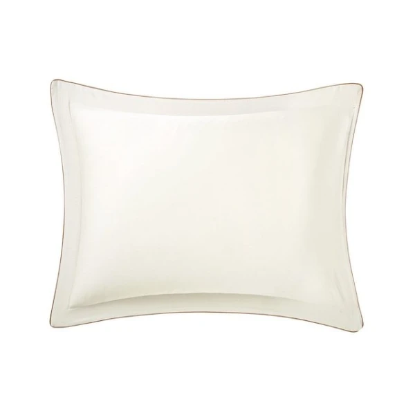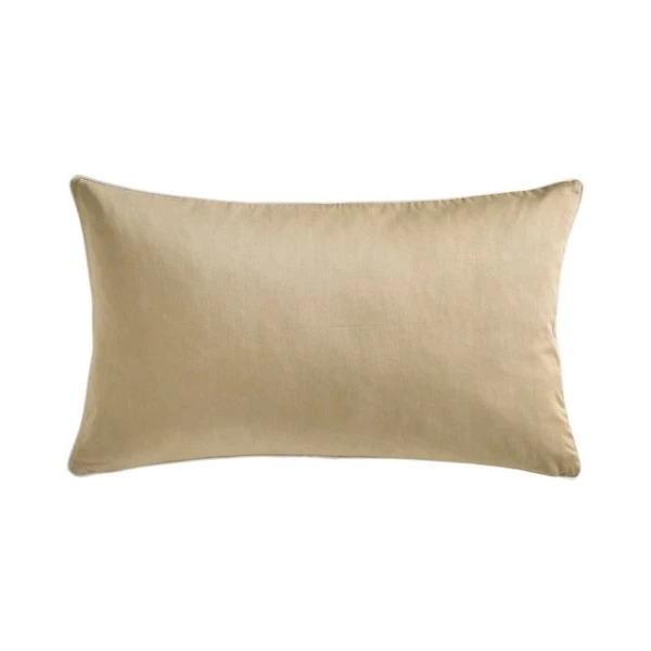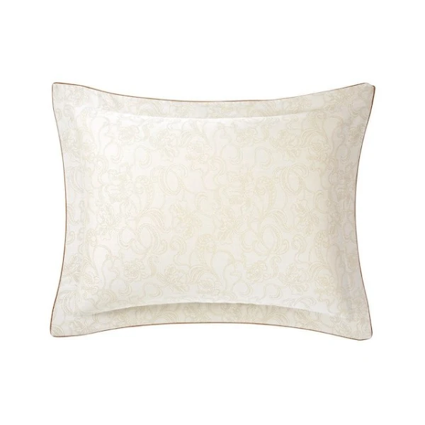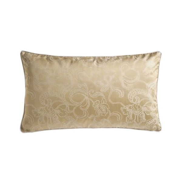 The coordinating decorative pillow is a cotton and silk jacquard with ivory piping. It reverse to a 100%cotton sateen. The down and feather inserts is included. 13 in x 22 in.