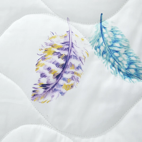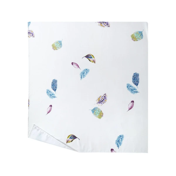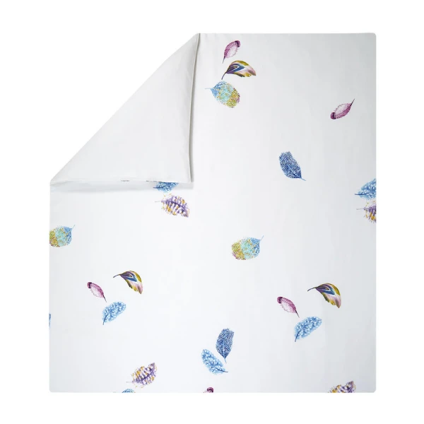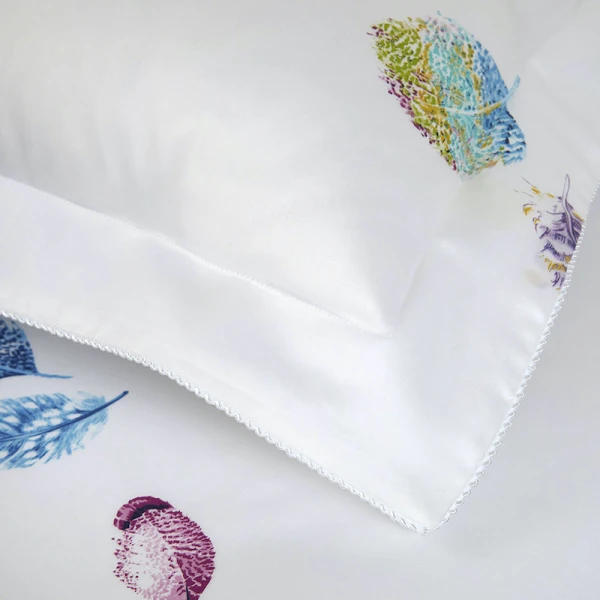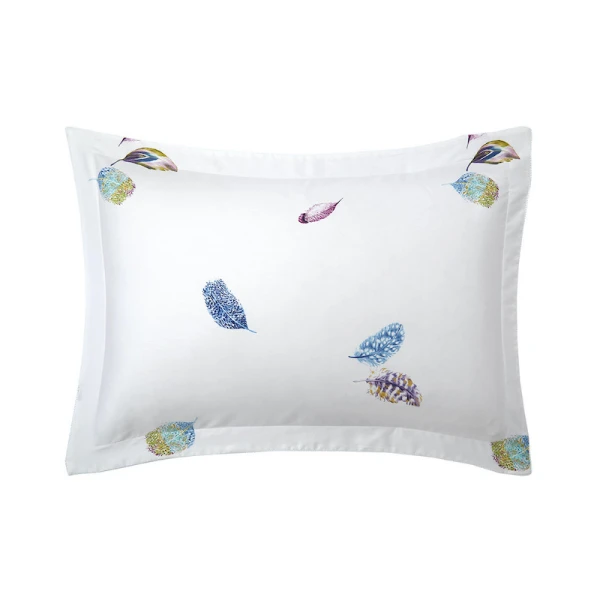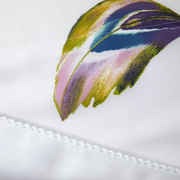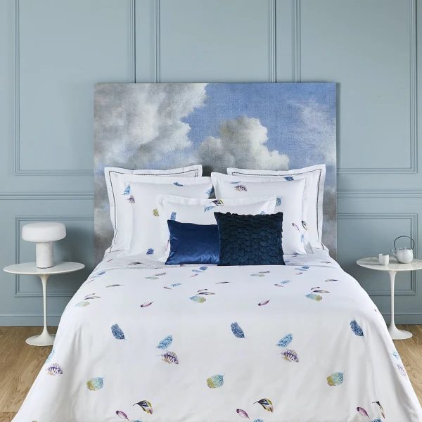 Yves Delorme's Celeste Bedding Collection is fresh and light.  Beautiful feathers of stunning jewel tones are scattered about on crisp white cotton sateen. You can choose to keep it light and pure or add more jewel tone accents to make a statement in you room. Printed on 300 TC long staple combed organic cotton. We recommend using Triomphe fitted sheets in Blanc or Marine. Made in France.