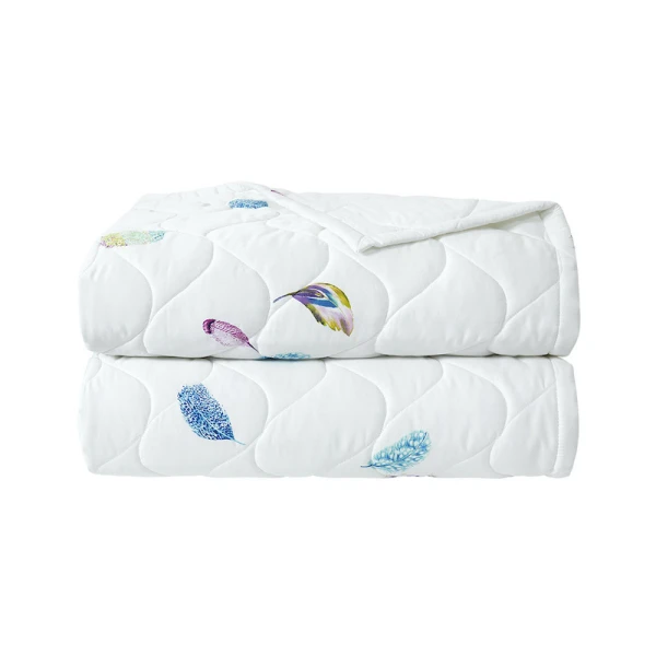 Yves Delorme's Celeste Quilted Coverlet is fresh and light. Beautiful feathers of stunning jewel tones are scattered about on crisp white cotton sateen. Wave stitching, 1 inch hem finish, polyester filling. Luxury long-staple combed organic cotton, printed sateen, 300 thread count. Made in France.