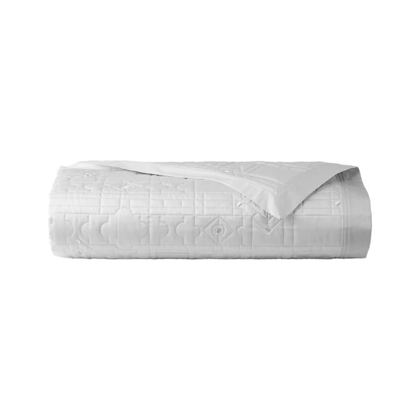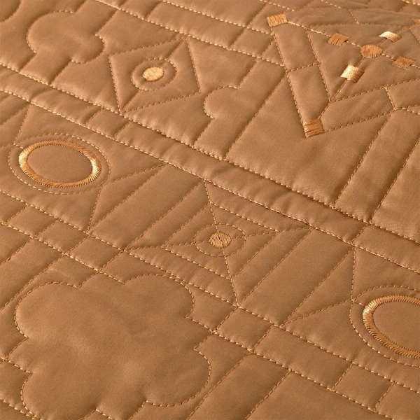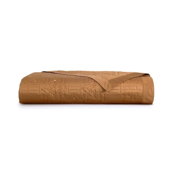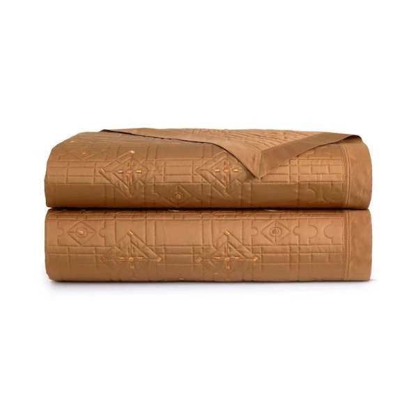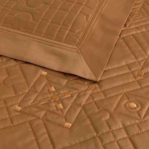 Allure is part of the Yves Delorme Couture collection. The Allure design is a sophisticated jacquard inspired by the rich marquetry on the floors and furnishings of the Palace of Versailles. The geometric harmony of the weave creates movement in shadow and light with natural golden reflections. This jacquard motif is created from an archive of the Versailles library. Quilted bedspread. Upholstered in 100% polyester. Geometric embroidery. 4-sided ruffle finish. Damask on 100% long staple combed organic cotton sateen, 500 thread count. Made with care in France.