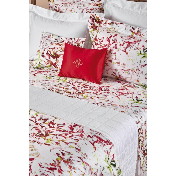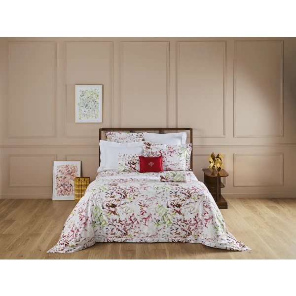 Luxury bedding from France by Yves Delorme is recognized for fashion prints, based on original artwork and heritage to haute couture, and timeless classics.  Arpege is a printed design on 500 tc long staple comber cotton sateen.  Bold colors of greens and red create a gorgeous backdrop for white crisp leaves to fall and rest.