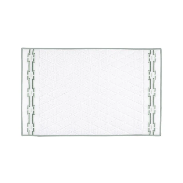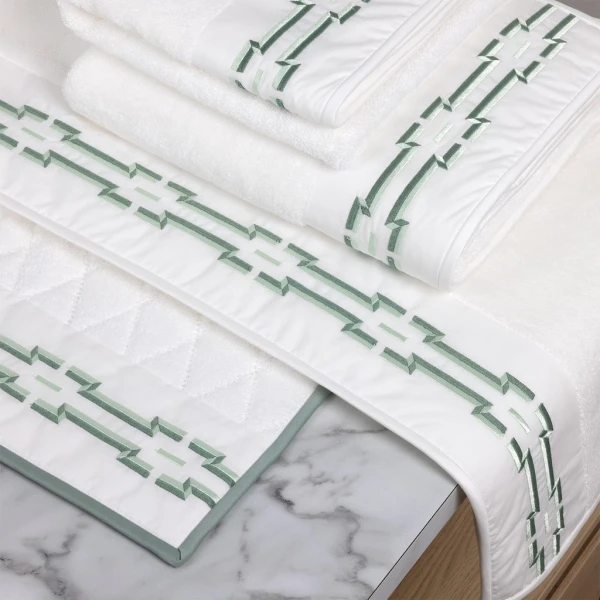 Yves Delorme's Couture's Tuileries Bath collection was Inspired by the topiaries of the beautiful Tuileries Garden in Paris that it's also named after, this bath linen collection by Yves Delorme Couture is designed with a two-tone geometric motif in shades of green. Plain dyed terry with embroidered geometric design, contrast bias finish. 100% organic cotton. Made with care in France.