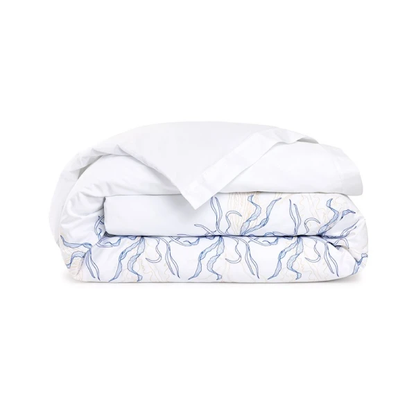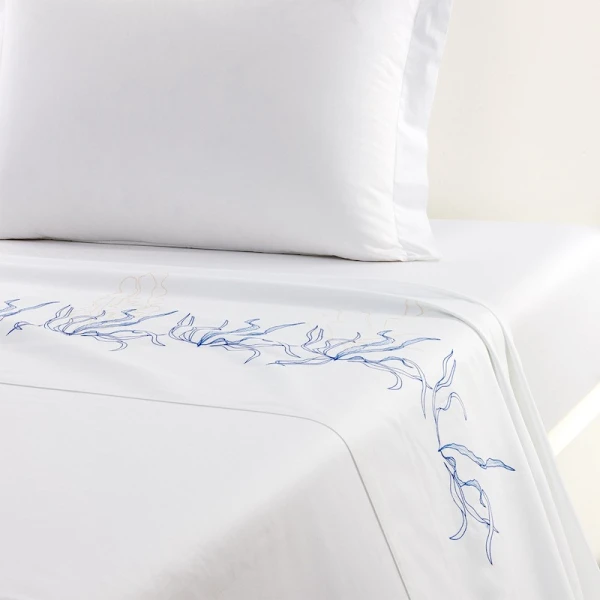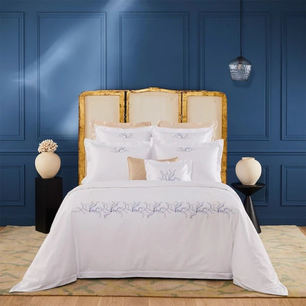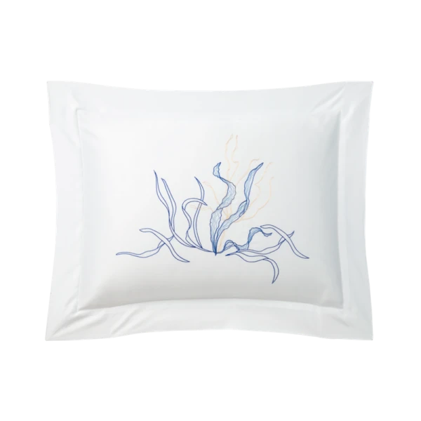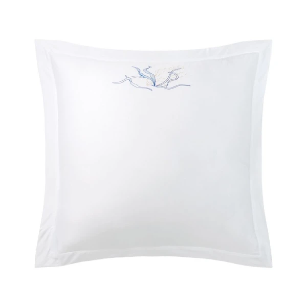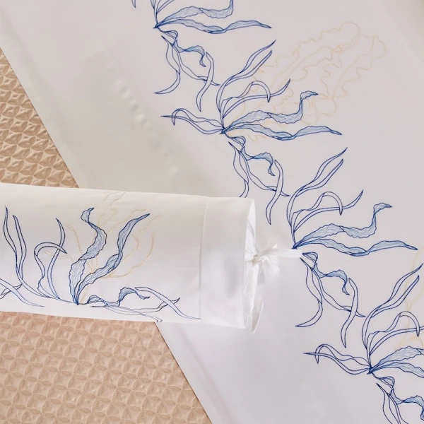 Lully is part of the Yves Delorme Couture collection. Inspired by the legendary submarine from Twenty Thousand Leagues Under the Sea, the Nautilus bed set invites you on an extraordinary voyage. The delicate embroidered design plays on the finesse of the stitches and the elegance of the shapes to draw enchanting seabeds. Sham with 2-inch flange, placed embroidery, ribbed stitching finish at edge of flange. Duvet cover with 2-inch flange on 3 sides, set embroidery, button closure under flaps, ribbed stitching finish. Flat sheet with 5-inch applied double facing hem, placed embroidery, tailored corners, ribbed stitching finish. 500 thread count. Cotton sateen. 100% extra-long staple combed PIMA cotton. Made with care in France.