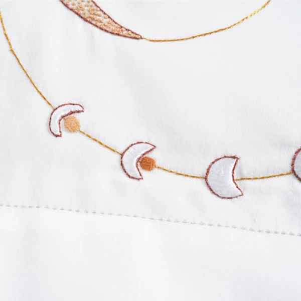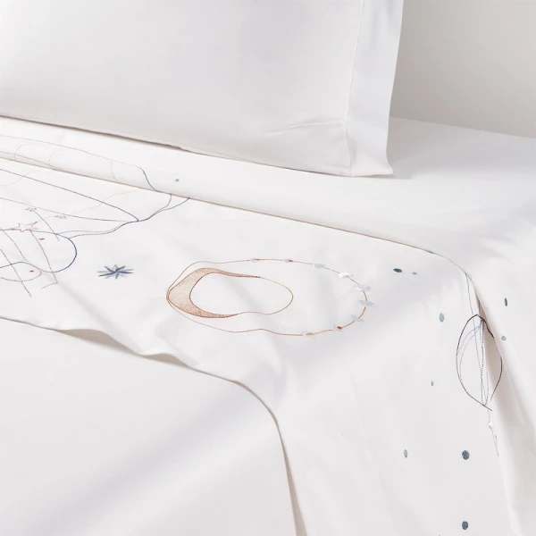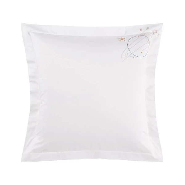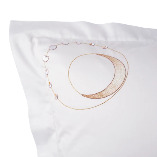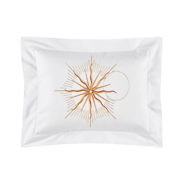 Olympe is part of the Yves Delorme Couture collection. This collection is handmade and entirely bespoke. Louis XIV made the sun his symbol. This embroidered design is an imaginary cosmic promenade with the sun at its center, imposing order and light on the kingdom of the Gods. Hand placed embroideries and 2’’ flange finish for duvet cover and shams. Please note: shams are sold by pairs because of embroideries placed left & right. Boudoir sham sold individually. Duvet cover, flat sheet 5’’ double facing flounce with tailored corners. Shams feature envelope closure. Duvet cover features button closure. Sateen, 100% PIMA cotton, 500 thread count. Yves Delorme collaborates with exceptional craftsmen: this model is made and hand-embroidered in Portugal.