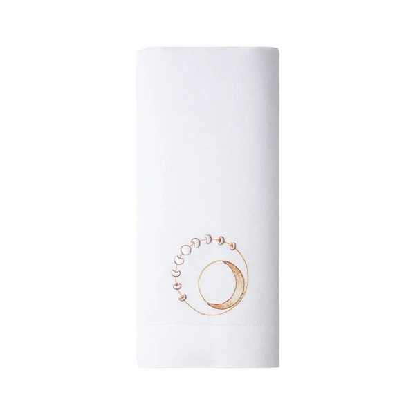 Yves Delorme Couture's Olympe Fingertip Towels are entirely done by hand. Louis XIV made the sun his symbol. This embroidery is an imaginary cosmic walk. The sun at its center imposes order and light on the kingdom of the gods. Hand embroidered towels. Different embroidery on each towel. Moon, Stars, and Sun. Handmade cross finish. Embroidered on 100% linen crepe. Designed in France and made in our partner workshops in Madagascar.