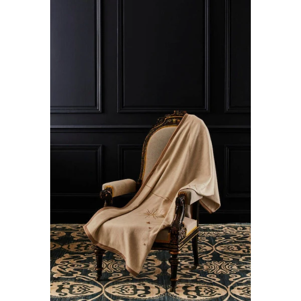 Yves Delorme Couture's Olympe Throw has the incomparable softness of 100% cashmere. This throw has unique and exceptional embroidery of great finesse that gives an exclusive touch to your home. Hand placed embroidery. Sateen bias finish on the reverse. 100% cashmere, 250 gsm. Made with care in France.