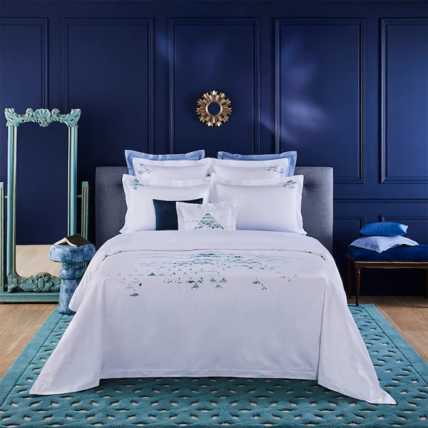 Rivoli is part of the Yves Delorme Couture collection. if you are on la Rue de Rivoli and direct your gaze towards the south, you will get a glimpse of the pyramid of the Louvre. This adornment of 673 glass diamonds offers us infinite reflections. This hand-embroidered design by Yves Delorme Couture virtuously interprets these reflections on cotton sateen. Shams with 2” flange and hand embroidered cross finish. Shams feature envelope closure. Standard and Euro Shams sold in pairs. Boudoir Sham and neckroll sold individually. Duvet cover features button closure. Flat Sheet features tailored corner panel. 100% Supima extra-long staple combed cotton sateen, 500 thread count. Created in France and made in our partner workshops in Portugal.