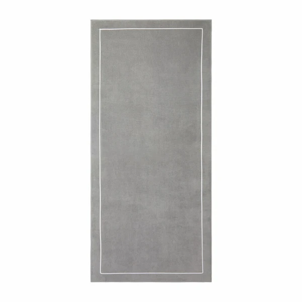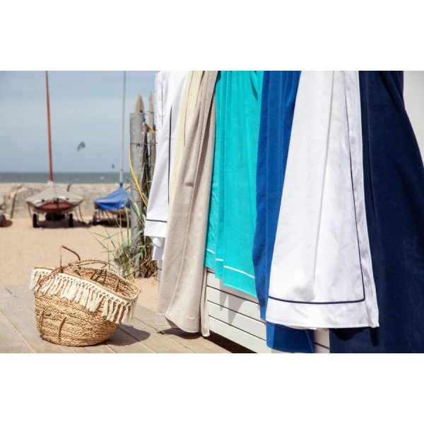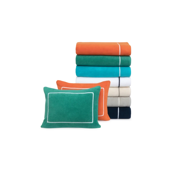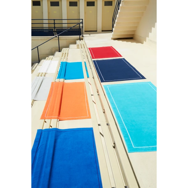 Yves Delorme Beach Towel Croisiere comfortably covers a standard deck chair and is finished with one stitch of colored bourdon embroidered piping. Named after the French word for 'cruise'. Also available in Beach Pillows. Collection comes in 7 color options. 100% organic cotton. Made in Turkey.