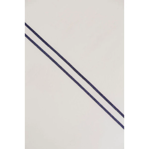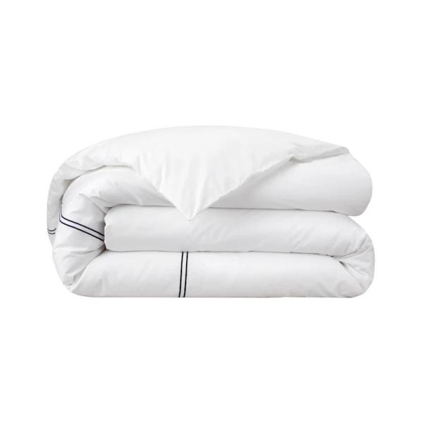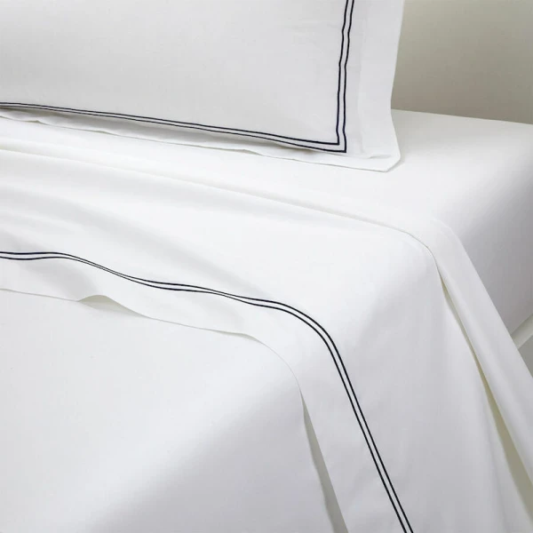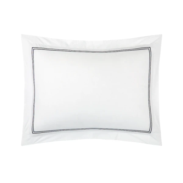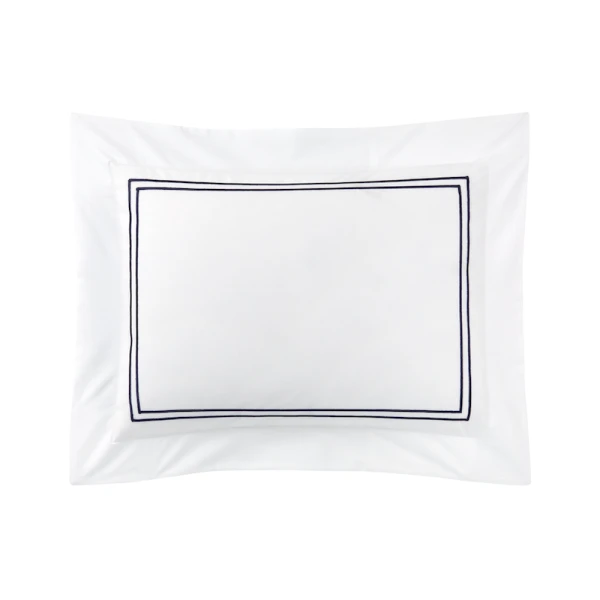 Yves Delorme Duo in Marine has double satin-stitch embroidery on white percale. The crisp, fresh and matte feeling of percale highlights the luster of the colored embroidery. 100% long staple combed cotton, 200 thread count. Made in France.