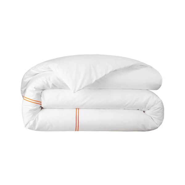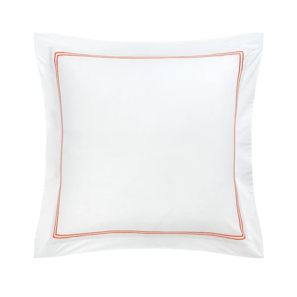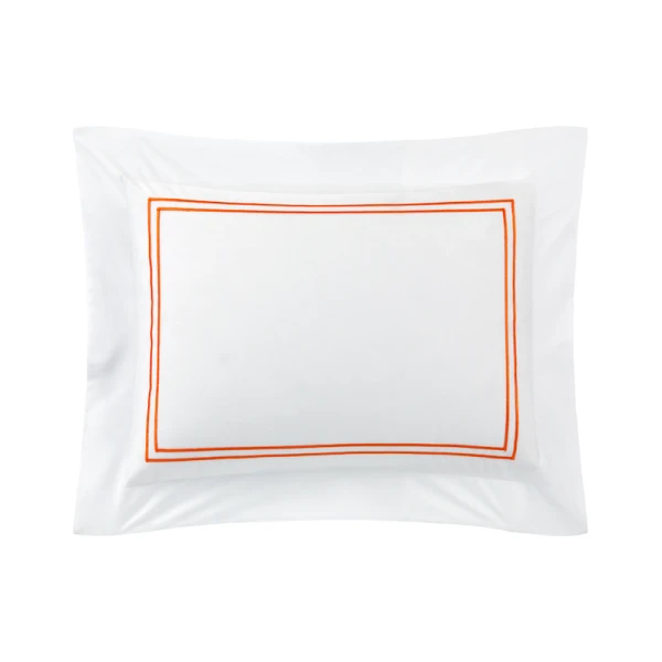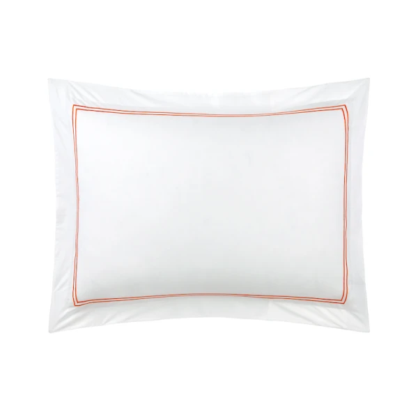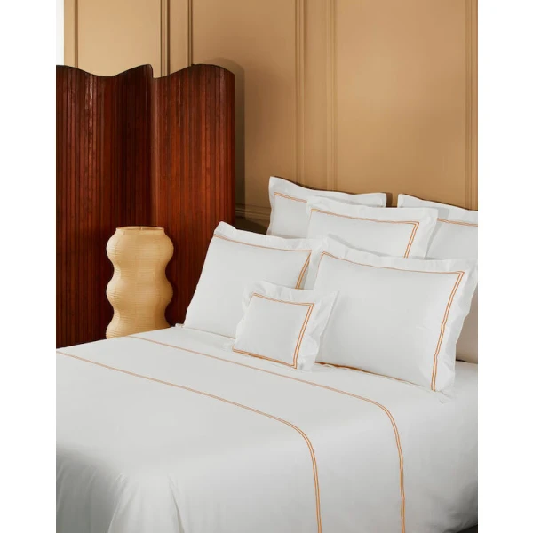 Yves Delorme Duo in Orange has double satin-stitch embroidery on white percale. The crisp, fresh and matte feeling of percale highlights the luster of the coloued embroidery. 100% long staple combed cotton, 200 thread count. Made in France.