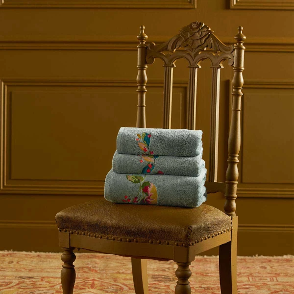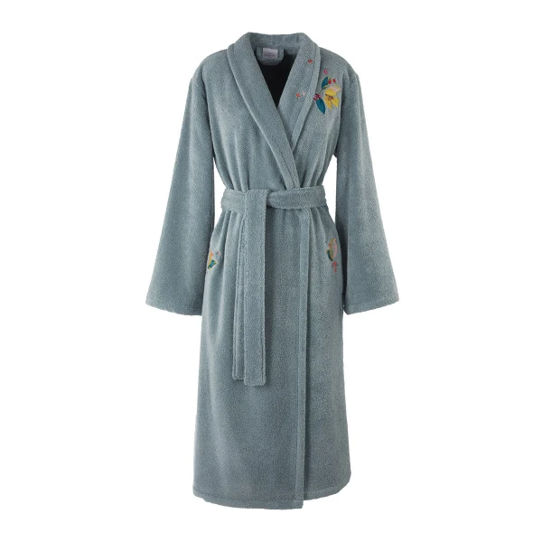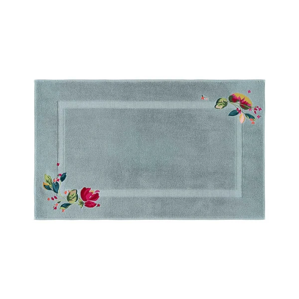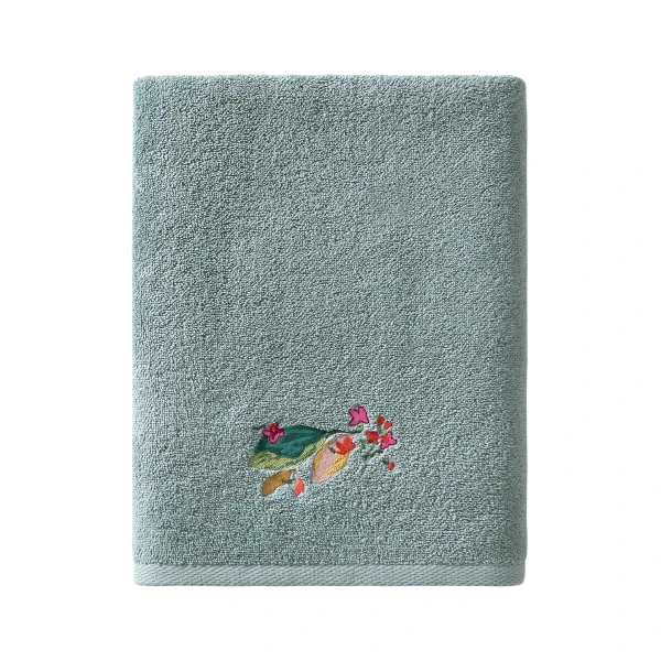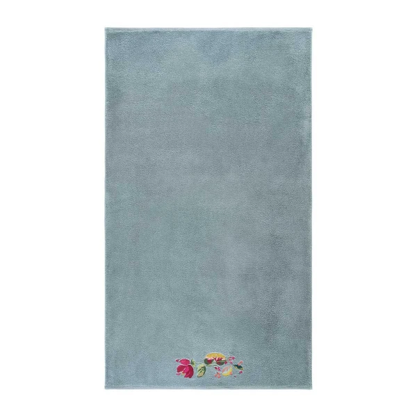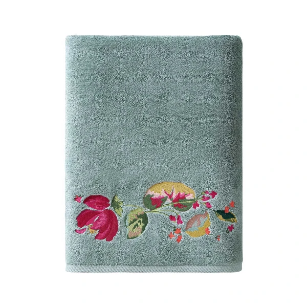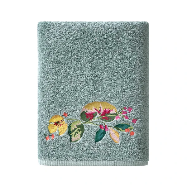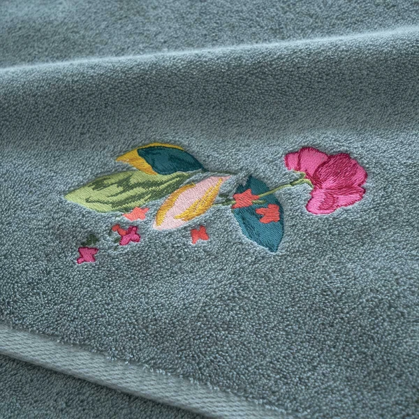 The Eaux bath linens from Yves Delorme are embroidered on classic Etoile toweling (82%cotton/17% modal).  Designed by Yves Delorme and produced by their partner in Turkey. Each size towel has a different embroidered field of flowers and lily pads on it. A coordinating bath mat is embroidered in the corners. Also available in a coordinating shawl collar women's bathrobe. Finished with a simple hem.