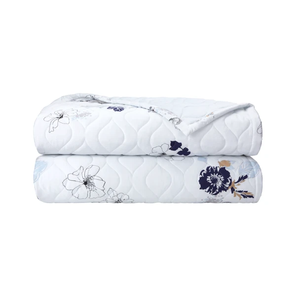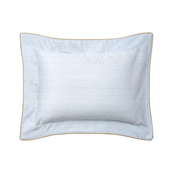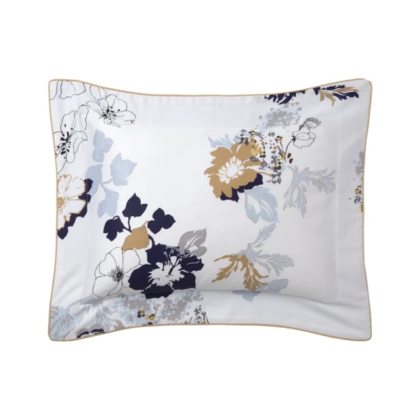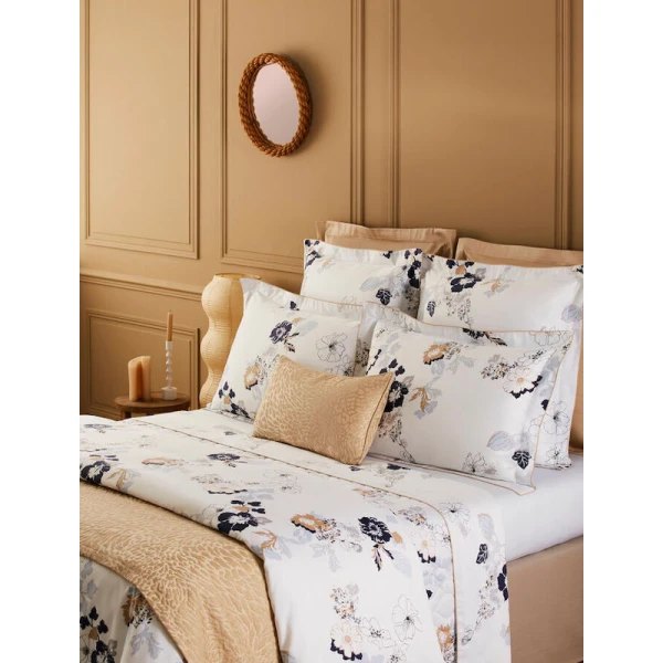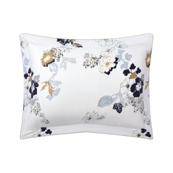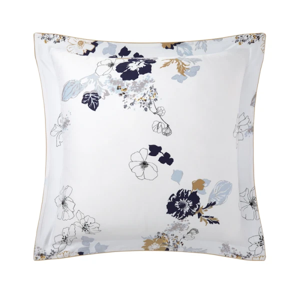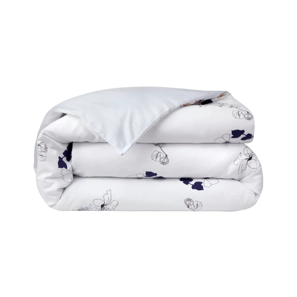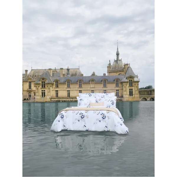 Yves Delorme's Eclipses Bed Collection is in a beautiful midnight blue, dune and sky hues that form a modern look. The design has an hidden moonlit evening with silhouette of flowers on sateen. Printed and reversible bed linens on 100% long staple combed organic cotton sateen, 300 thread count. 12 colors for the main design with one color for the coordinating pattern on the reverse side. Made in France.
