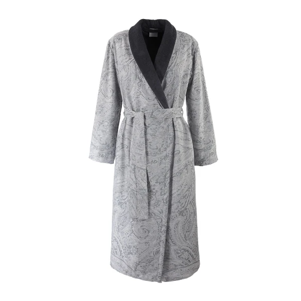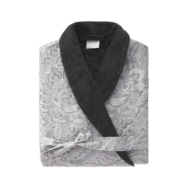 The Foulard robe -- from Yves Delorme -- is a jacquard woven pattern of a paisley like foulard -- woven in two tones (anthracite and brume) for a traditional look. The Foulard sheeting is used for the outside of the robe while the inside is a lightweight terry in a dark grey (anthracite). The robe comes with a self belt and is a below the knee style. All 100% organic cotton.