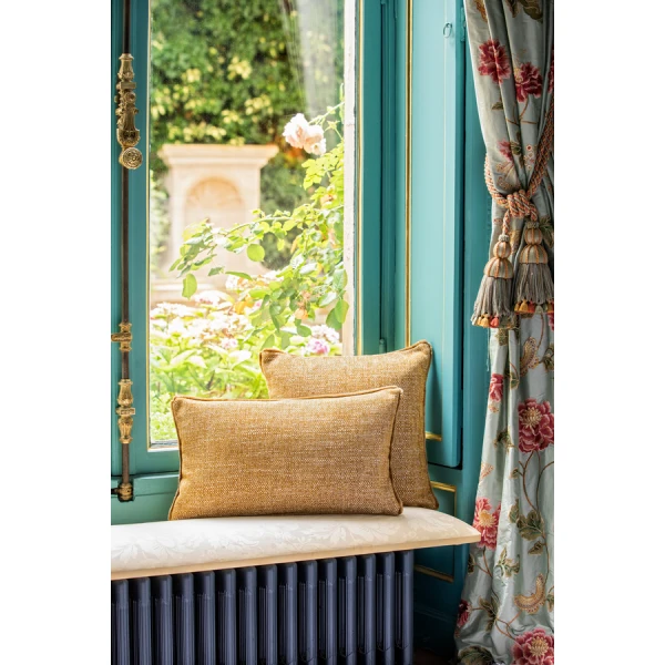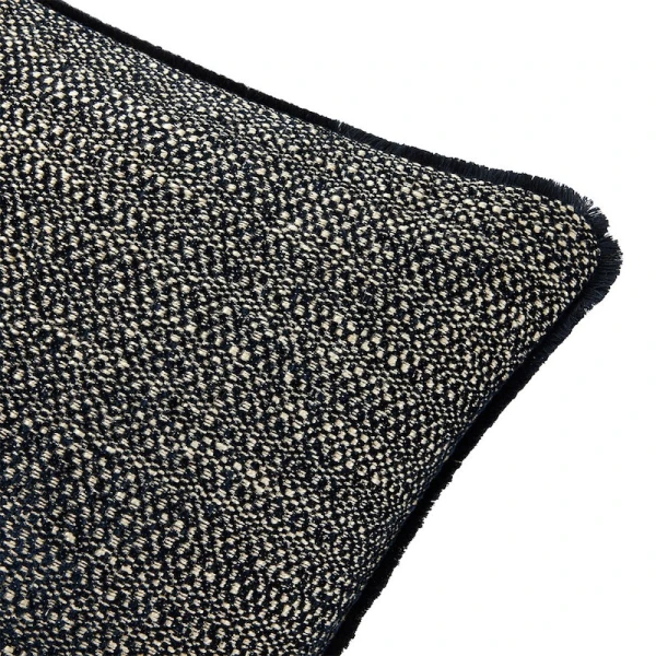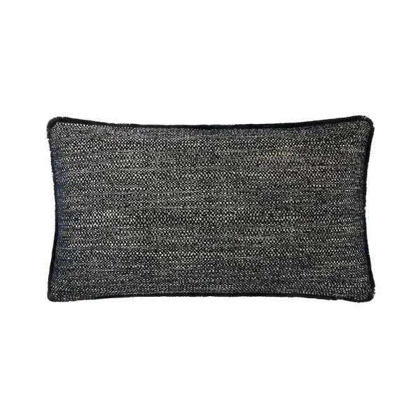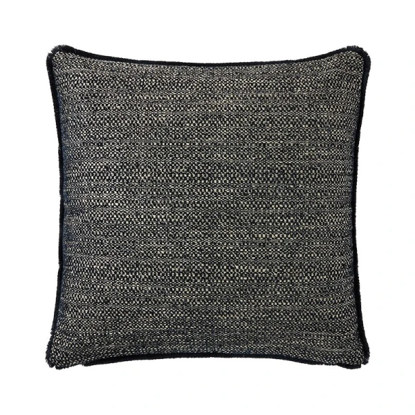 Yves Delorme's Geode Iosis Decorative Pillow in Nuit has a fine Italian chenille weave. It is available in various solid colors of various shades and a matching short fringe. Woven in Italy. Geode is textured on front and back. Fringe finish and zipper closure at the bottom of the cushion cover. 40% Acrylic, 28% Cotton, 27% Viscose, 5% Linen. Made in Italy