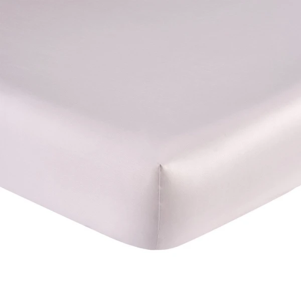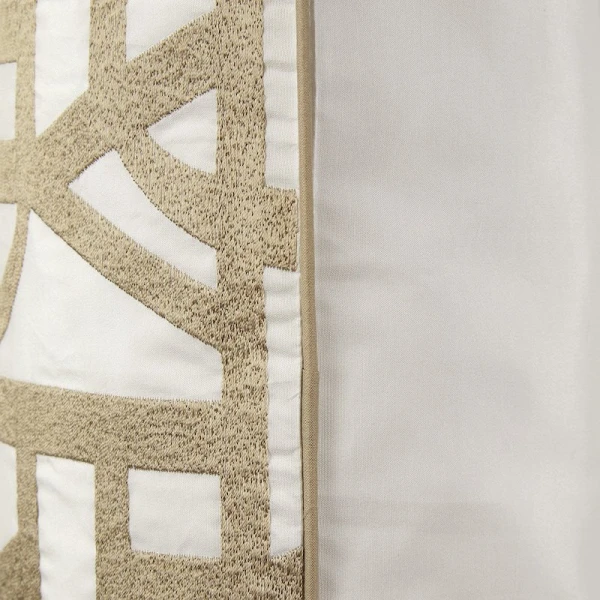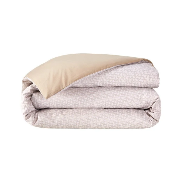 The reversible duvet cover and shams are a damask weave. Saddle stitch for shams and flat sheets. Duvet Cover with flap and button closure. Fitted sheet in plain dyed sateen.