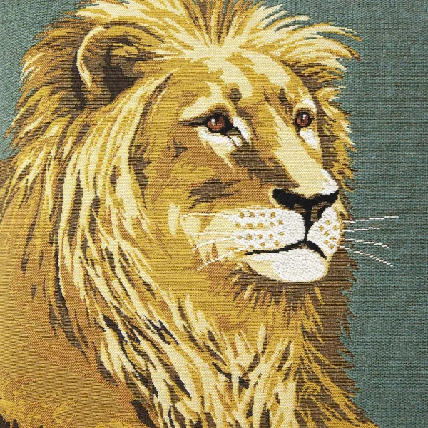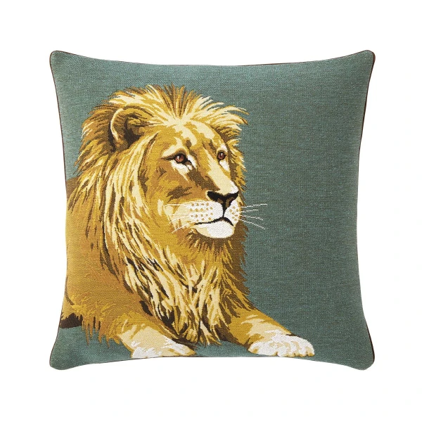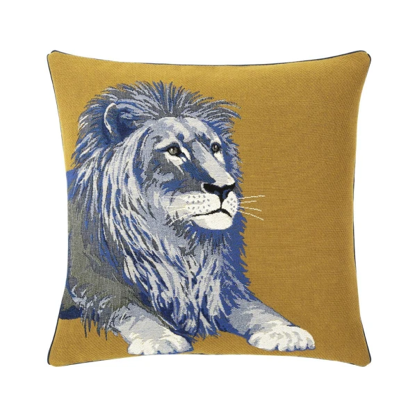 Iosis' decorative pillow Mimosa got its inspiration the king of the jungle.  A swift portrait of the majestic lion of the savannah.  Woven tapestry, lion portrait, piped finishing around perimeter, zipper closure along bottom side, 18 in x 18 in.  Available in 2 colors: Ambre & Savane.  Down & feather insert included.