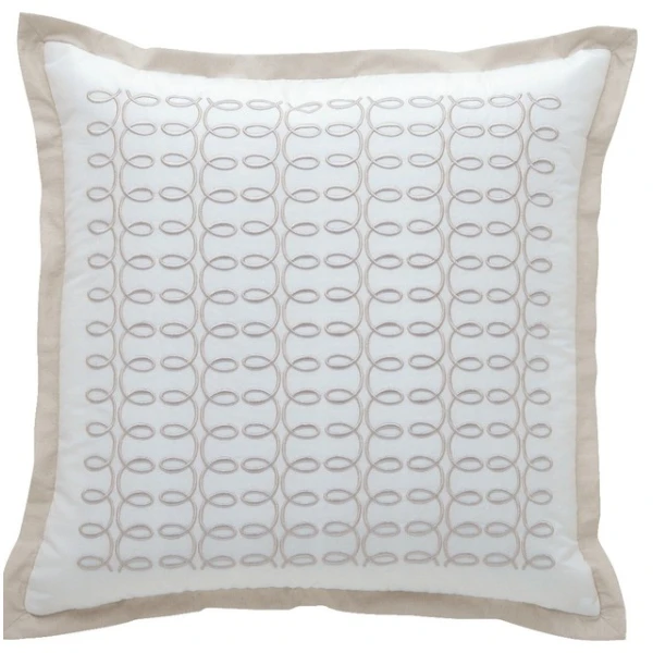 Embroidered on silk, the Italics decorator pillow from Yves DeLorme has a small flange all around. Ivory silk on the front and cafe cream (taupe) on the back, the flange and the embroidery, The pillow measures 17 x 17. Purchase 95/5 feather/down insert separately. The rows of looped embroidery make the pillow formal enough for a living room and casual enough for a bedroom.
