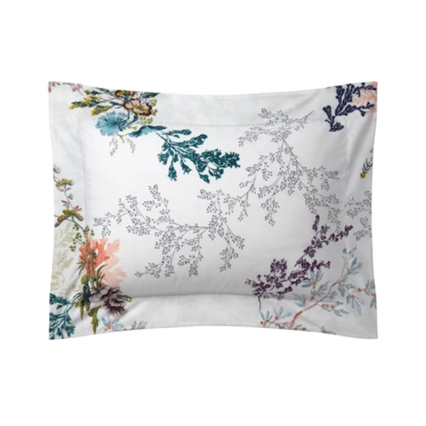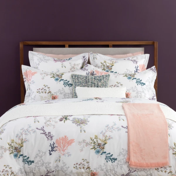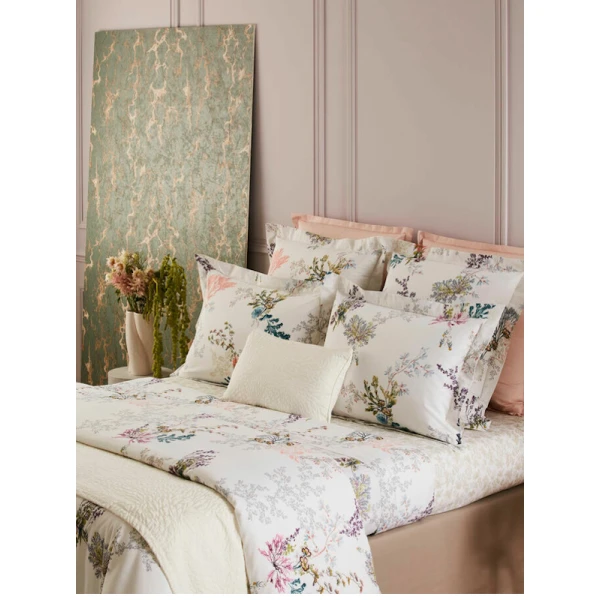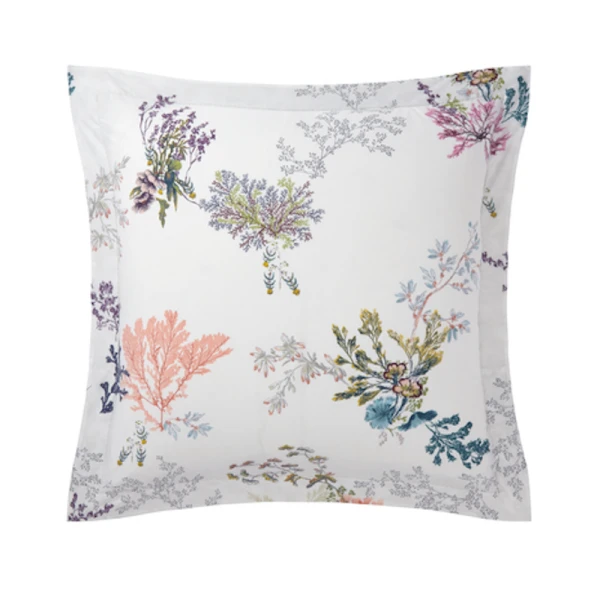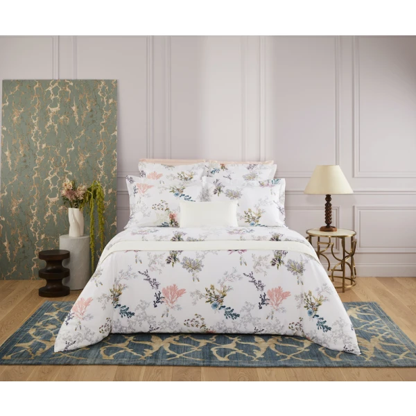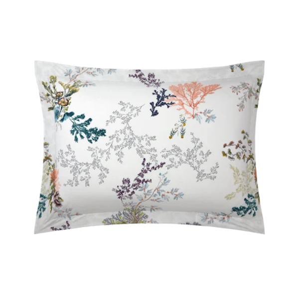 Yves Delorme's Naiades Bed Collection is designed after fairytale world where naiads bring aquatic plants to life. Pen sketches and light watercolors on white cotton batiste. 100% long staple combed organic cotton batiste, 200 thread count. 14 colors for main design, 1 color for coordinated design. Made in France.