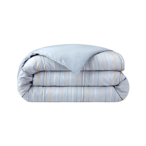 Duvet cover, front in woven dyed fabric, reverse in solid Céleste blue, button closure.