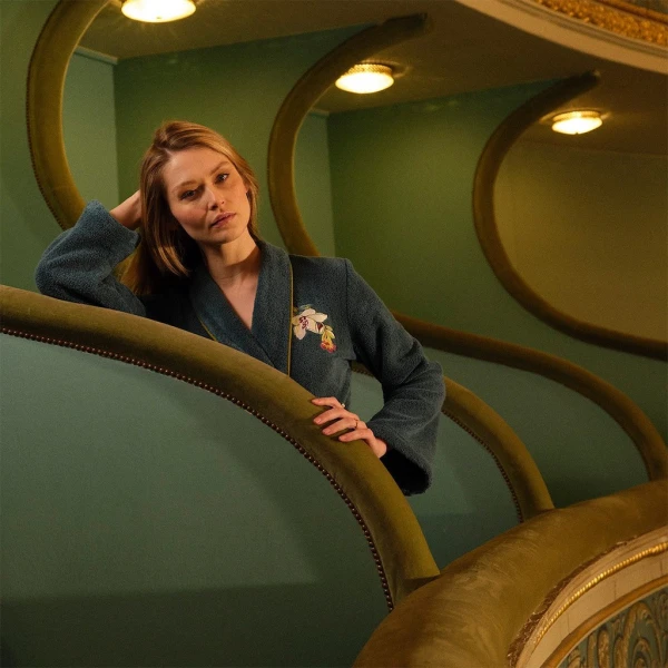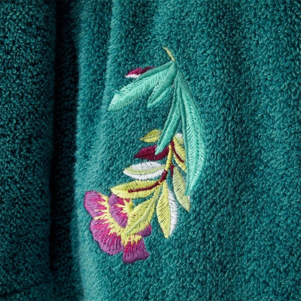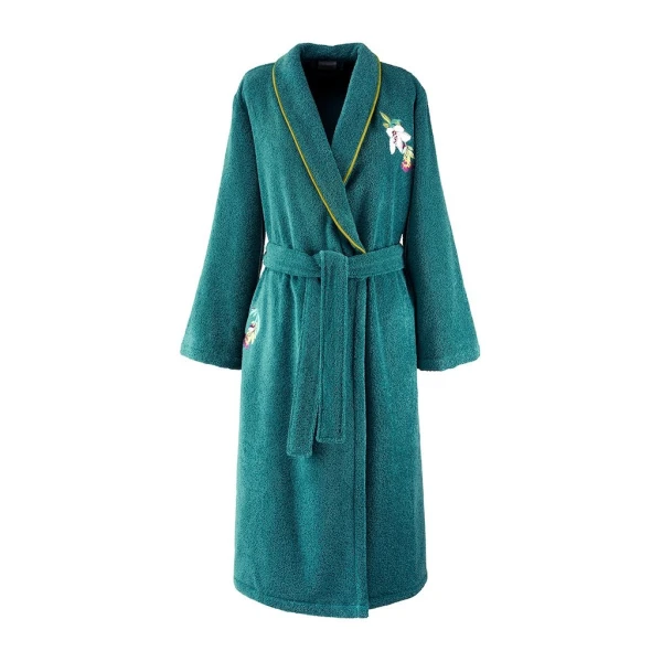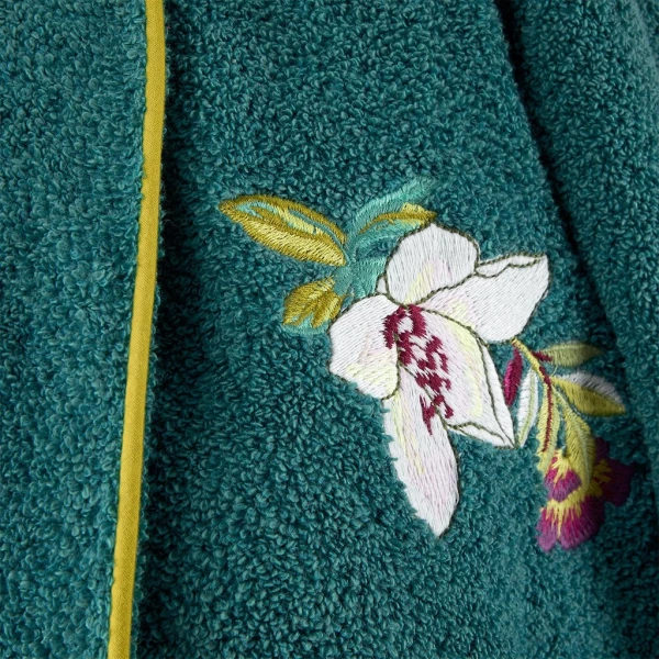 Yves Delorme's Panorama Shawl Collar Bath Robe has chest and pocket area that are highlighted with flower embroidery. Shawl collar piping finish and inside pockets. 83% organic cotton, 17% modal cotton, 450 gsm. Designed in France and made in our partner workshops in Türkey. Article certified STANDARD 100 by OEKO-TEX.