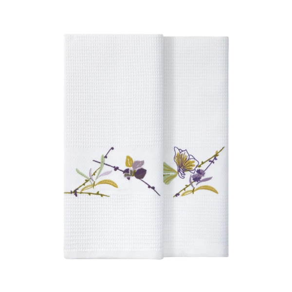 Yves Delorme's Saito finger tip towels are in a white waffle weave with the Saito design embroidered on for a sweet embellishment. Sold as a pair. 100% organic cotton.  Made in Turkey for Yves Delorme.