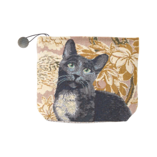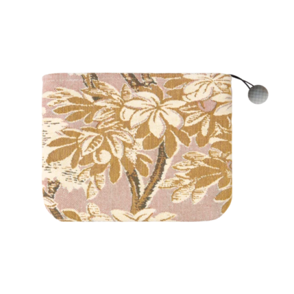 Iosis' Scarlett Tote in Rose The has pretty a face with an enticing gaze. She poses in front of a background of tapestry greenery in springtime hues. Inside lining in cotton sateen. Cotton tapestry woven in Belgium. Zipper closure with cord and button, 6 in x 9 in.