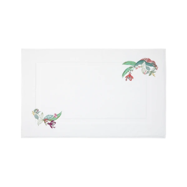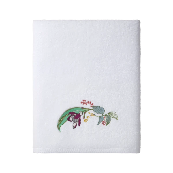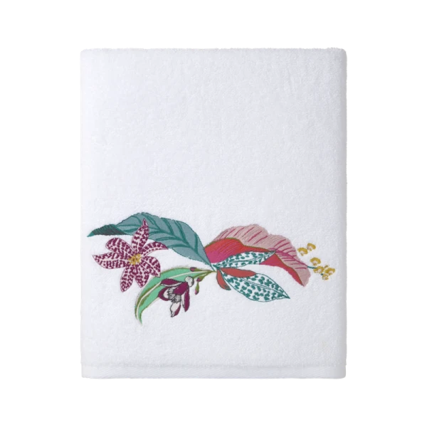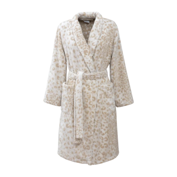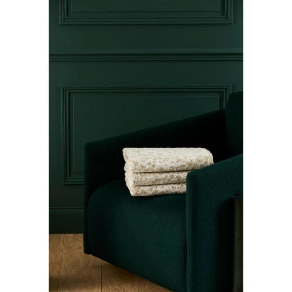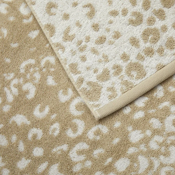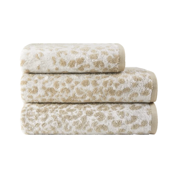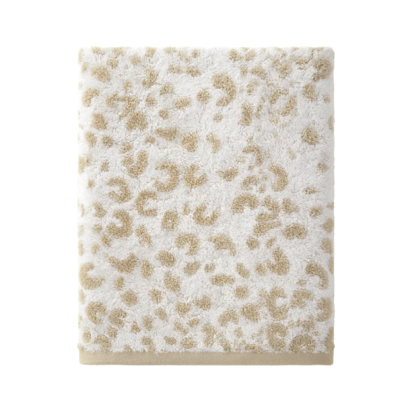 Yves Delorme's Tioman towels are a jacquard weave in a leopard spots pattern.  Simple border finish at top and bottom.  Great neutral color. 65% organic cotton and 35% modal.  This towel has more modal in it than Etoile -- making it super soft. Made with care in France.