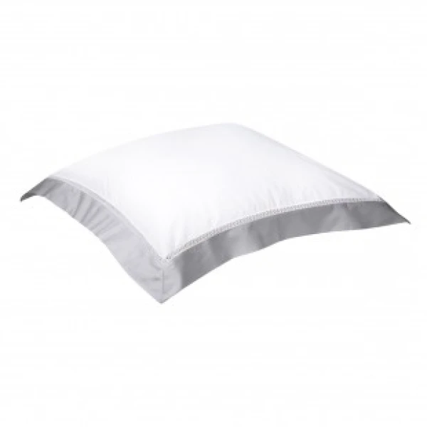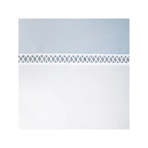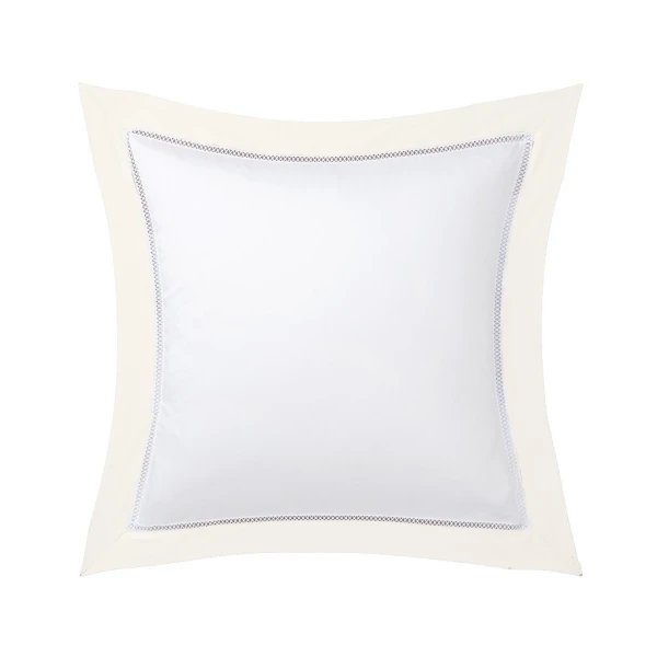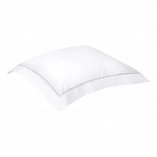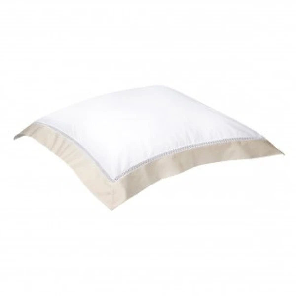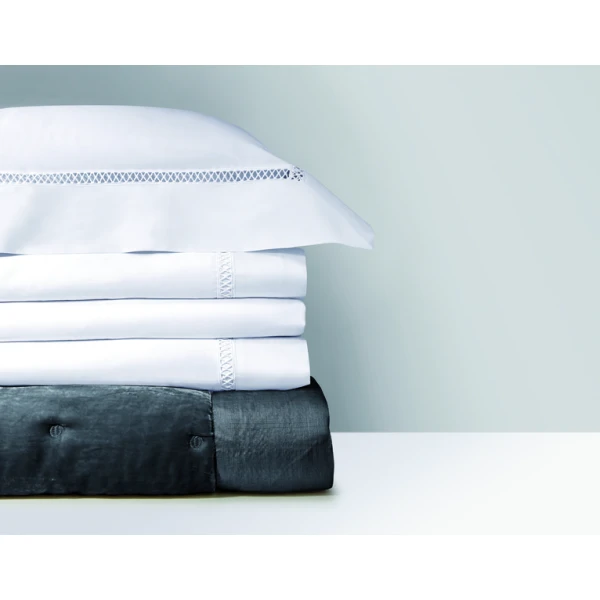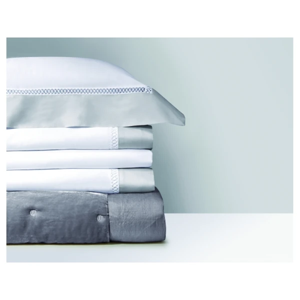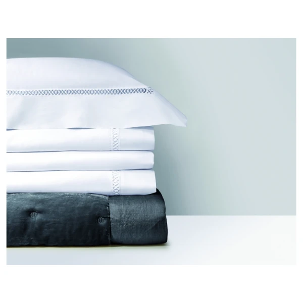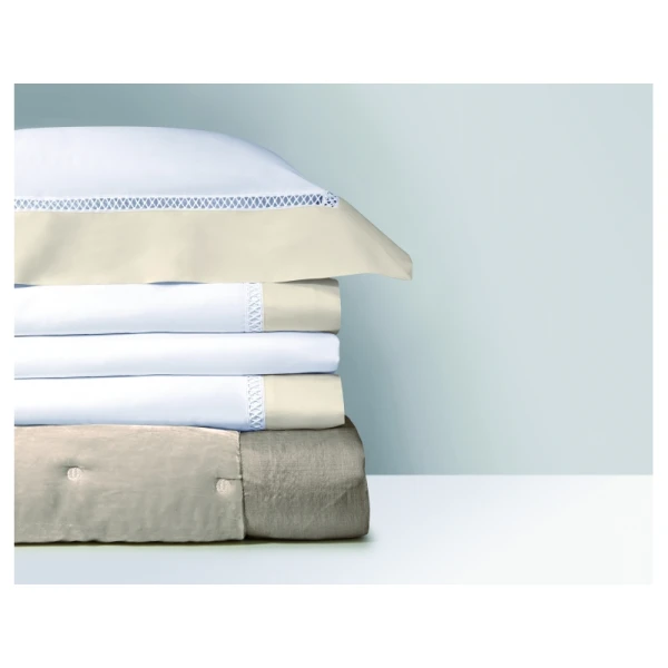 Walton, part of Yves DeLorme's luxury collection, uses Triomphe white sheeting in sateen and has an attached border in one of two colors, white or nacre.  The border is attached with a cross faggot hemstitch on the duvet, the flat sheet and the shams. Use Triomphe in white, or the matching border color as the fitted sheet. Long staple combed cotton sateen, 310 TC and made in France.
